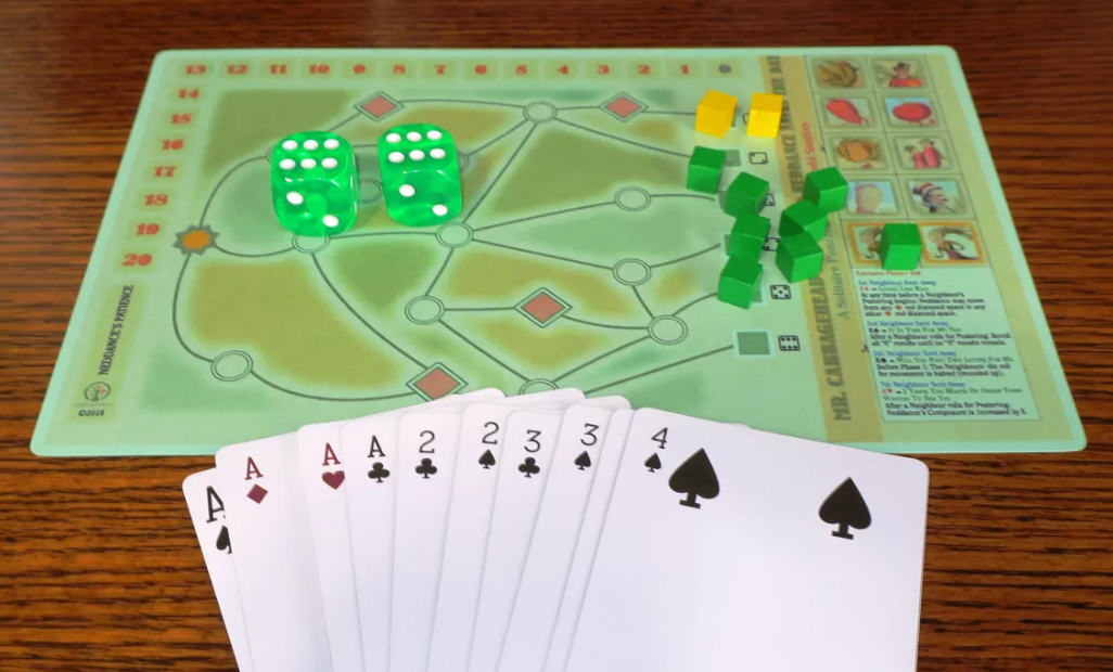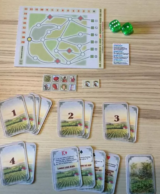 Mr. Cabbagehead is Away and Neddance Saves the Day is a solo postcard game based on Mr. Cabbagehead’s Garden. In this game, you play as Neddance, tasked with protecting Mr. Cabbagehead’s garden from his persistent neighbors while he is away. Using dice and a standard deck of cards, you must manage Neddance’s patience and strategically send away the neighbors before they deplete her composure.