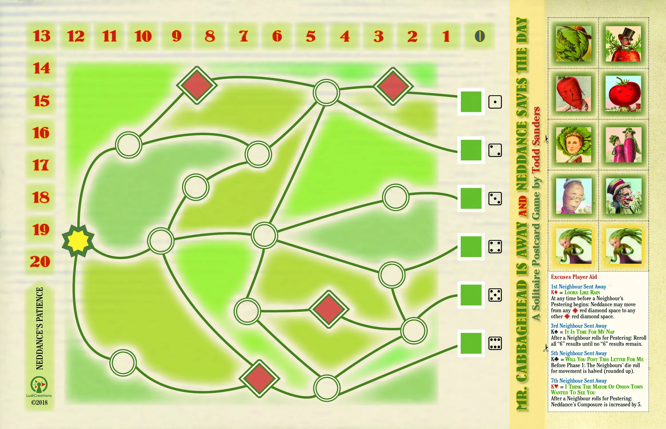 Mr. Cabbagehead is Away and Neddance Saves the Day is a solo postcard game based on Mr. Cabbagehead’s Garden. In this game, you play as Neddance, tasked with protecting Mr. Cabbagehead’s garden from his persistent neighbors while he is away. Using dice and a standard deck of cards, you must manage Neddance’s patience and strategically send away the neighbors before they deplete her composure.