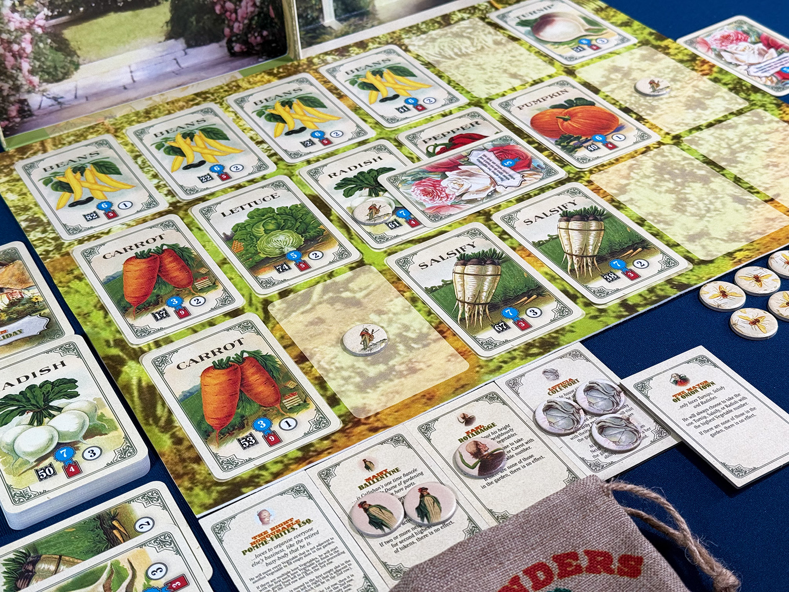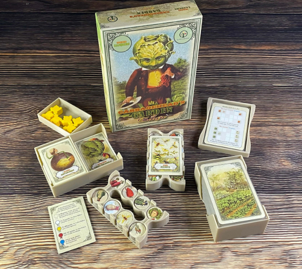 Mr. Cabbagehead’s Garden, is a relaxing, drafting and pattern-building card game for 1–2 players, with playtime of about 15–20 minutes. In it, you help Vernon Cabbagehead cultivate an award-winning vegetable garden while managing bees and fending off meddlesome neighbors who may sneak in to steal his produce, especially when he takes his periodic holidays.